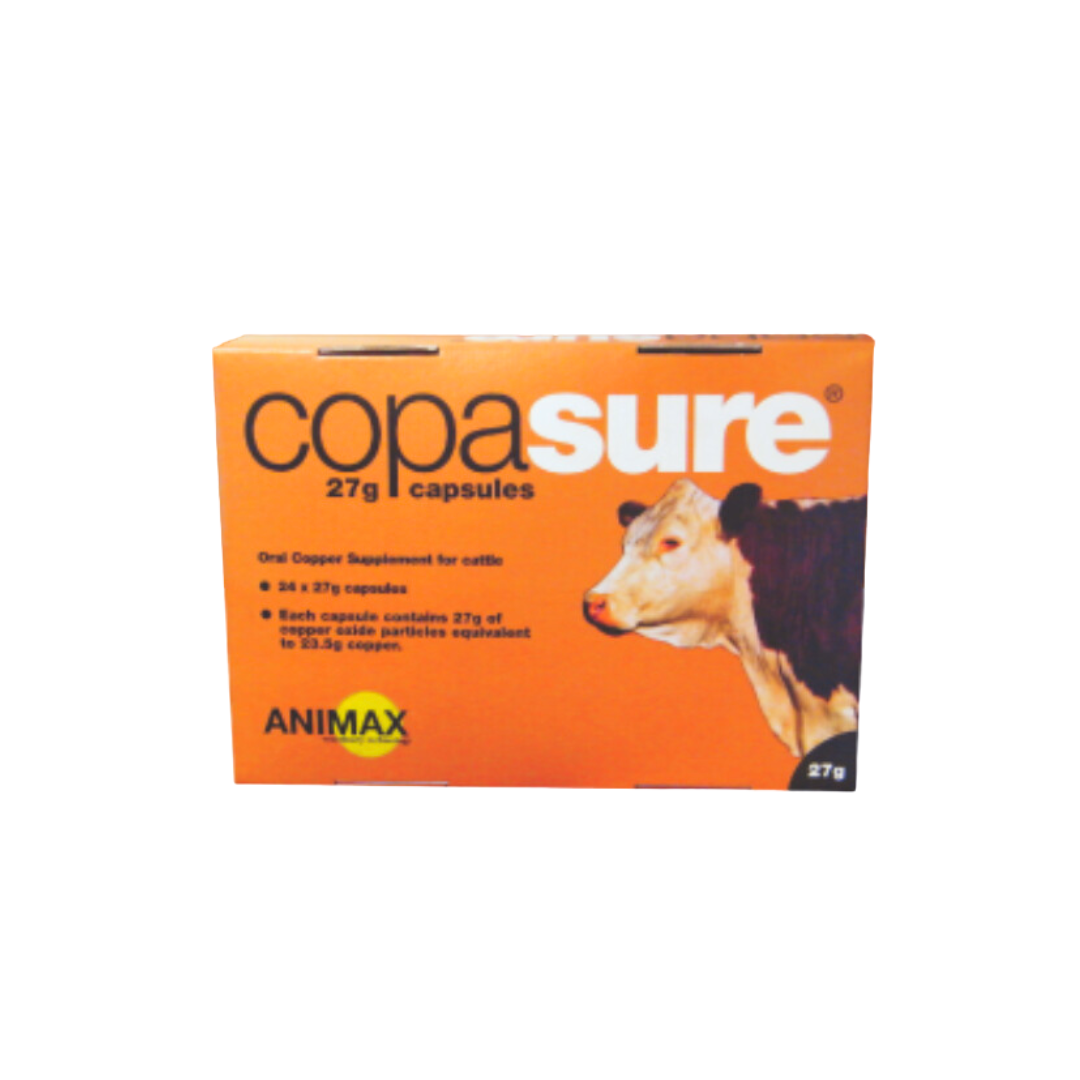Animax Copasure bolus are for the prevention and treatment of copper deficiency. If your animals are suffering from copper deficiency (hypocuprosis) they will show a loss in performance and susceptibility to disease. Young stock (100-250 kg bw) receive one 27g (maroon) capsule (equivalent to 108 mg CuO/kg for a 250 kg animal). Cattle (over 250 kg bw) receive one or two 27g (maroon) capsules, depending on the severity of the copper deficiency. (One capsule is equivalent to 67.5mg CuO/kg for a 400kg animals, 2 capsules are equivalent to 135mg CuO/kg for a 400kg animal).