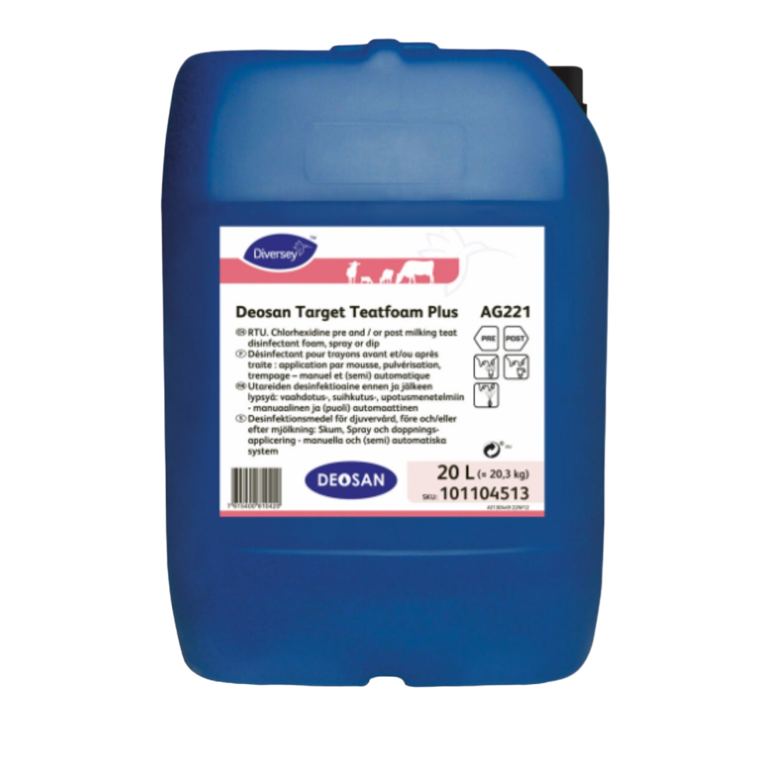 Deosan Target Teatfoam Plus is a fast and effective pre and post milking teat disinfectant. Deosan Target Teatfoam Plus contains a powerful combination of 6000ppm Chlorhexidine and 1000ppm Amphoteric biocides giving a total of 7000ppm that meets the high standards of microbial testing required for teat disinfection. Exceeding the EN1656 test, by killing bacteria in 30 seconds. The test includes Straph. aureus, Strep. uberis and E.coli bacteria.