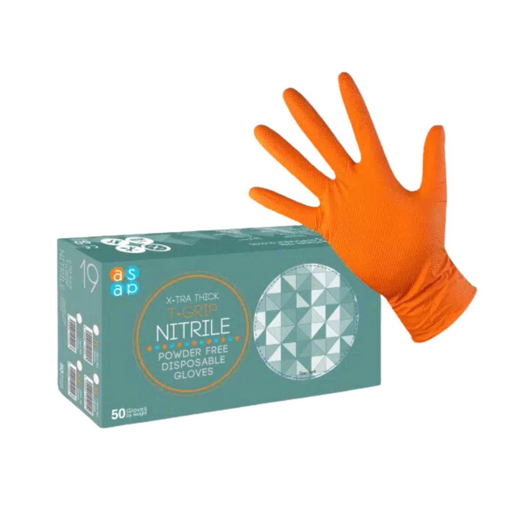 ASAP X-Tra Thick T-Grip Orange Nitrile Disposable Glove – the ultimate hand protection for those who demand exceptional quality and grip in their work. Engineered with a diamond grip pattern, these gloves provide an unbeatable hold even in wet and oily conditions, reducing the risk of accidents and ensuring your safety. With their extra thickness, these gloves offer superior durability and resistance to tears, punctures, and abrasions, making them perfect for demanding tasks in the automotive sector. The vibrant orange colour enhances visibility and prevents cross-contamination, making them a reliable choice for professionals in various industries. Experience the power of ASAP X-Tra Thick T-Grip Gloves and elevate your performance today.