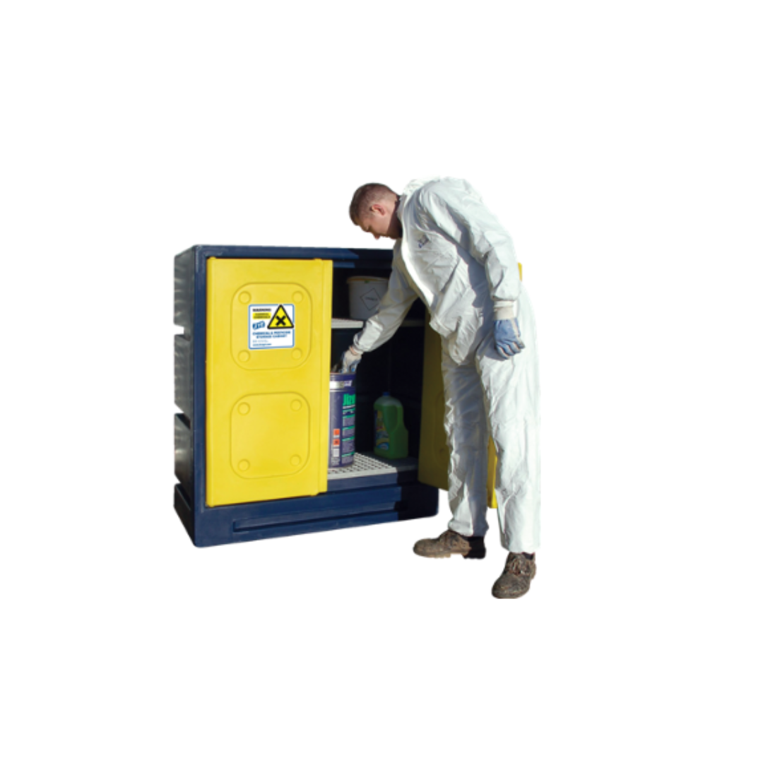 Our large chemical storage cabinet is ideal for the safe storage of pesticides and other farm chemicals. Complete with two doors this lockable storage cabinet features two perforated rust-proof and chemical resistant shelves with a maximum load capacity of 120kg, an air vent to the side and a drain-off. The chemical storage cabinet includes a 125L bund capacity safety feature to control any possible spillages ensuring your chemicals are stored in accordance with farm inspection requirements.