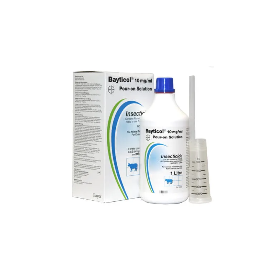 Bayticol 1% is a pour on solution for the control of ticks and biting lice, as well as the control of sucking lice and mange.